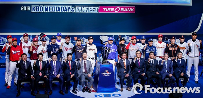 (서울=포커스뉴스) 28일 오후 서울 용산구 브루스퀘어 삼성카드홀에서 열린 '2016 타이어뱅크 프로야구 미디어데이 & 팬페스트' 행사에 참석한 10개 구단 감독 및 선수들이 기념촬영을 갖고 있다.