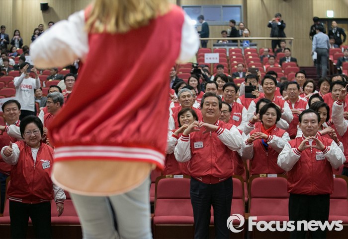 (서울=포커스뉴스) 28일 오후 서울 여의도 국회 의원회관에서 열린 새누리당 20대 총선 공천자대회에 참석한 김무성, 원유철 공동선대위원장 등 지도부와 후보들이 선거유세 율동을 배우고 있다.