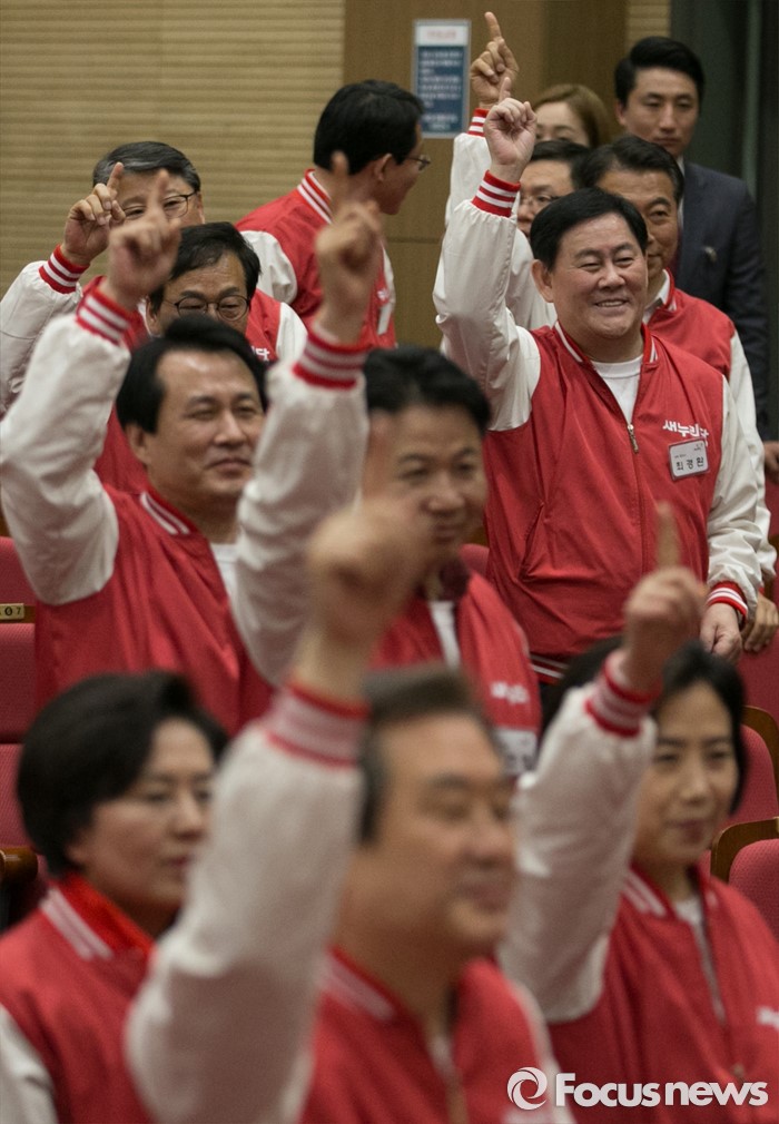 (서울=포커스뉴스) 28일 오후 서울 여의도 국회 의원회관에서 열린 새누리당 20대 총선 공천자대회에 참석한 김무성(왼쪽 아래) 공동선대위원장 등 지도부와 최경환 경북 경산 후보 등 후보들이 선거유세 율동을 배우고 있다.