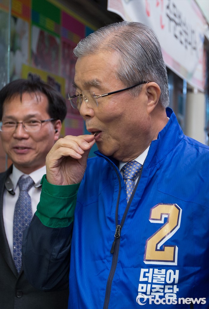 (진천=포커스뉴스) 김종인 더불어민주당 비상대책위 대표가 28일 오후 충북 진천군 중앙시장을 방문, 떡을 맛보고 있다.