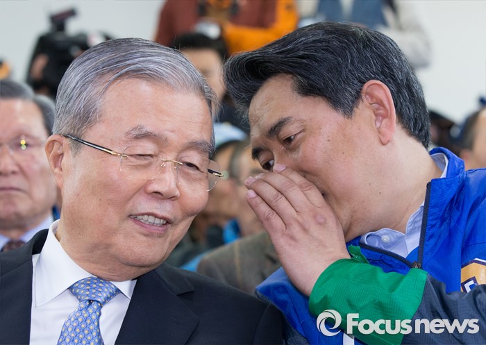 (괴산=포커스뉴스) 김종인 더불어민주당 비상대책위 대표가 28일 오후 충북 괴산군 정당선거사무소에서 열린 20대 총선 충북 후보 연석회의에서 이재한 이재한 후보와 귀엣말을 나누고 있다.
