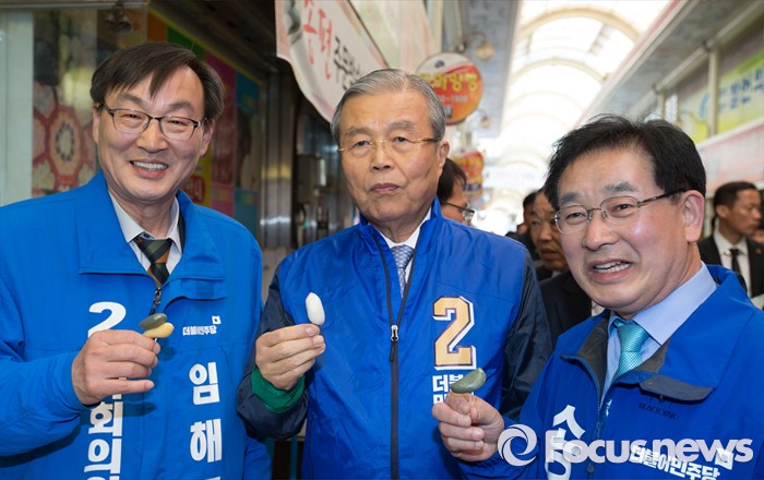 (진천=포커스뉴스) 김종인 더불어민주당 비상대책위 대표가 28일 오후 충북 진천군 중앙시장을 방문, 후보자들과 떡을 맛보고 있다.