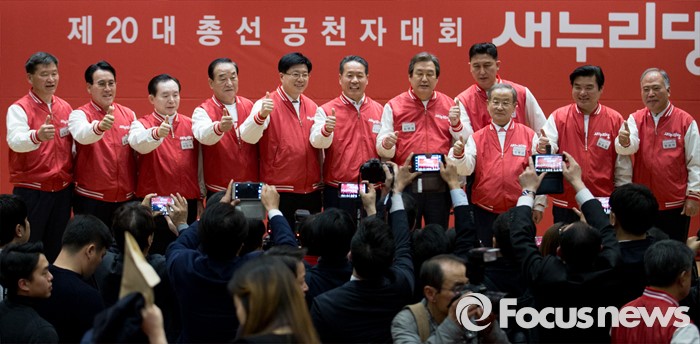 (서울=포커스뉴스) 28일 오후 서울 여의도 국회 의원회관에서 열린 새누리당 20대 총선 공천자대회에 참석한 전남 지역 후보들과 지도부가 기념촬영을 하고 있다.