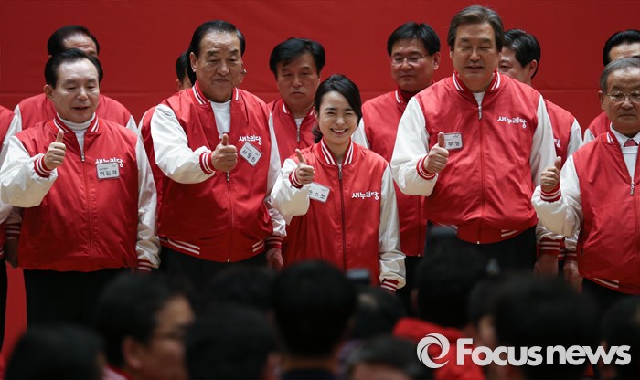(서울=포커스뉴스) 28일 오후 서울 여의도 국회 의원회관에서 열린 새누리당 20대 총선 공천자대회에 참석한 손수조 부산 사상구 후보와 공동선대위원장이 기념촬영을 하고 있다. 오른쪽부터 강봉균, 김무선 위원장, 손 후보, 서청원, 이인제 위원장.