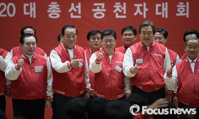(서울=포커스뉴스) 28일 오후 서울 여의도 국회 의원회관에서 열린 새누리당 20대 총선 공천자대회에 참석한 윤상직 부산 기장군 후보와 공동선대위원장이 기념촬영을 하고 있다. 오른쪽부터 강봉균, 김무선 위원장, 윤 후보, 서청원, 이인제 위원장.