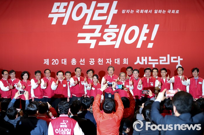 (서울=포커스뉴스) 28일 오후 서울 여의도 국회 의원회관에서 열린 새누리당 20대 총선 공천자대회에 참석한 부산 지역 후보들과 공동선대위원장들이 기념촬영을 하고 있다.
