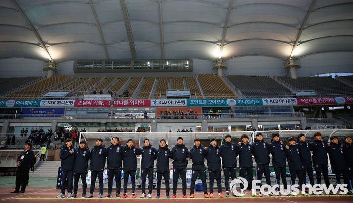 (고양=포커스뉴스) 28일 오후 경기 고양종합운동장에서 열린 올림픽축구대표팀 2차 평가전 대한민국과 알제리의 경기에서 신태용 감독과 코치진이 애국가를 부르고 있다.