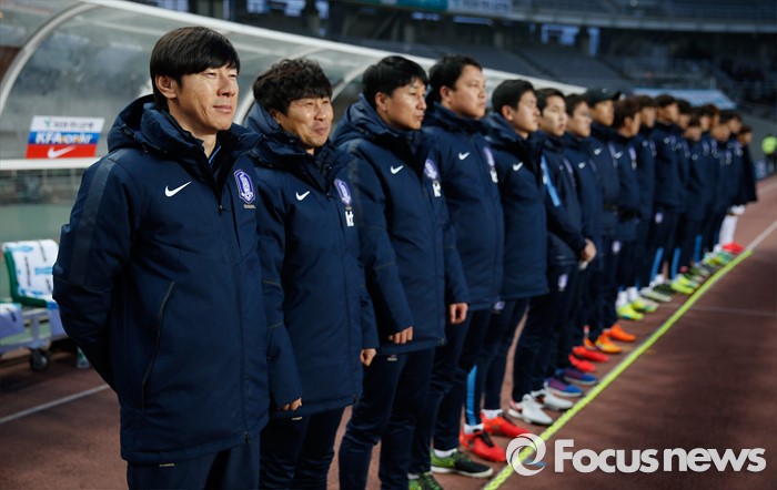 (고양=포커스뉴스) 28일 오후 경기 고양종합운동장에서 열린 올림픽축구대표팀 2차 평가전 대한민국과 알제리의 경기에서 신태용 감독과 코치진이 경기시작을 기다리고 있다.