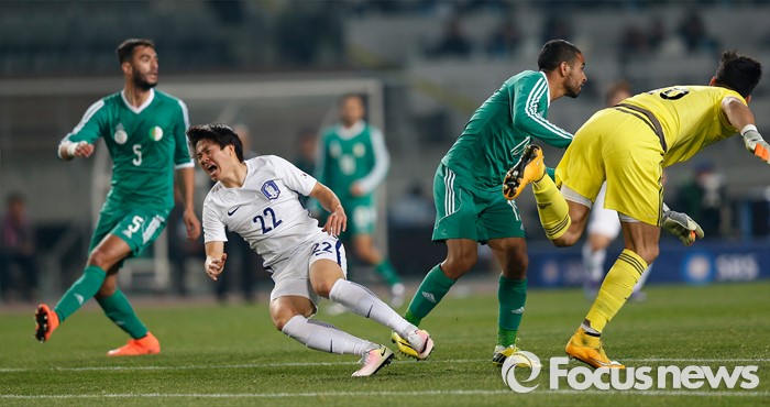 (고양=포커스뉴스) 28일 오후 경기 고양종합운동장에서 열린 올림픽축구대표팀 2차 평가전 대한민국과 알제리의 경기에서 한국 권창훈이 알제리 골키퍼와 부딪히며 넘어지고 있다.