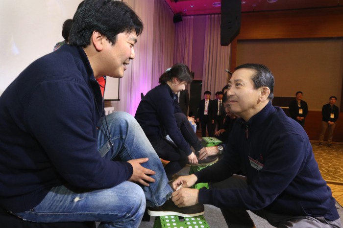 LG유플러스는 이번 점장 리더십 캠프 개최 의미에 대해 “권 부회장 취임 이후 첫 공식 워크숍을 전국 점장들과 함께 했다는 건 이들을 그 만큼 소중하게 여기고 있다는 뜻”이라고 밝혔다.직원들의 신발끈을 묶어주고 있는 권영수 LG유플러스 부회장.<사진제공=LG유플러스>