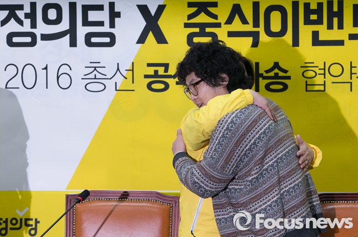 (서울=포커스뉴스) 29일 오전 서울 여의도 국회에서 열린 정의당-중식이밴드 2016 총선 공식 테마송 협약식에 참석한 심상정 상임선대위원장이 중식이밴드의 보컬 정중식과 포옹하며 인사하고 있다.