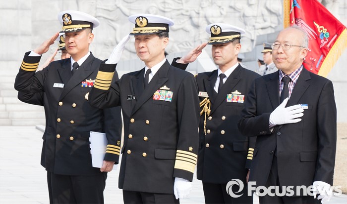 (대전=포커스뉴스) 다케이 도모히사(왼쪽 두 번째) 일본 해상막료장(해군참모총장)이 29일 오전 대전 유성구 국립대전현충원을 방문, 참배를 마치고 현충탑을 나서며 거수경례를 하고 있다.
