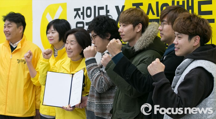 (서울=포커스뉴스) 29일 오전 서울 여의도 국회에서 열린 정의당-중식이밴드 2016 총선 공식 테마송 협약식에 참석한 심상정(왼쪽 세번째) 상임선대위원장과 중식이밴드가 협약서에 서명한 뒤 기념촬영을 하고 있다.
