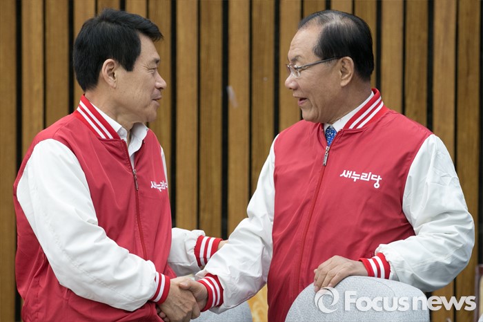 (서울=포커스뉴스) 20대 총선에서 무투표 당선된 이군현(왼쪽) 새누리당중앙선대위 공동 총괄본부장이 29일 오전 서울 여의도 국회에서 열린 첫 중앙선거대책위원회의에 참석해, 황우여 의원과 악수하고 있다.