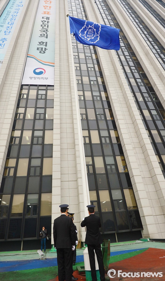 (서울=포커스뉴스) 29일 오전 서울 종로구 정부서울청사에서 대한민국 정부기 게양식이 열렸다. 이날 행사에 참석한 정부 관계자들이 기존 무궁화 도안 정부기를 내리고 있다. 정부는 67년간 사용해온 '무궁화'에서 '태극' 도안으로 바뀐 새 정부기를 정부세종청사와 서울청사 등 10개 청사에 게양했다.