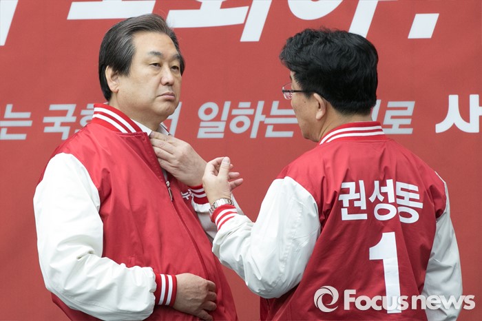 (서울=포커스뉴스) 김무성(왼쪽) 새누리당 대표가 29일 오전 서울 여의도 국회에서 열린 첫 중앙선거대책위원회의에 참석해, 권성동 의원과 대화하고 있다.