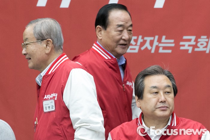 (서울=포커스뉴스) 김무성(오른쪽) 새누리당 대표와 서청원(가운데) 최고위원, 강봉균 공동 선대위원장이 29일 오전 서울 여의도 국회에서 열린 첫 중앙선거대책위원회의에 참석하고 있다.