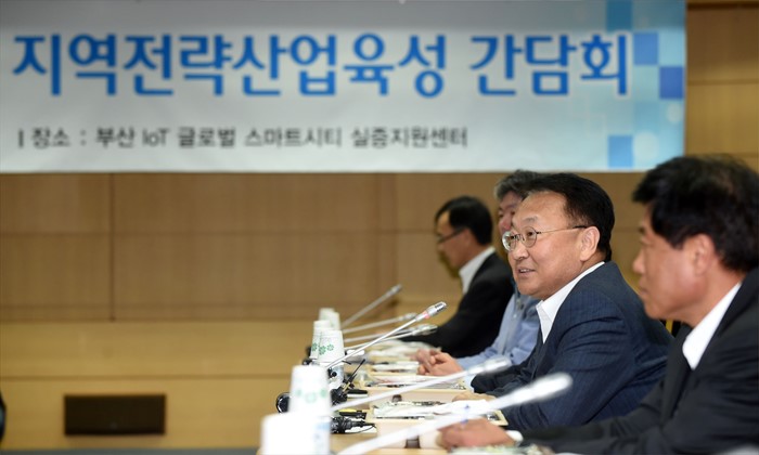 (부산=포커스뉴스) 유일호 부총리 겸 기획재정부 장관이 29일 규제프리존을 통한 지역전략산업육성을 위한 현장으로 부산시 소재 IoT 글로벌 스마트시티 실증지원센터를 방문, 관계기관 및 관련업체와의 간담회에서 모두발언을 하고 있다. <사진제공=기획재정부>