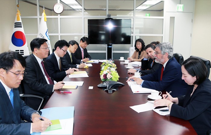 (서울=포커스뉴스) 주형환 산업통상자원부 장관은 29일 오후 서울 종로구 정부서울청사 외교부 집무실에서 ‘한미 과학기술협력 공동위원회’에 참석하기 위해 방한중인 존 홀드렌 (John P. Holdren) 미국 백악관 과학기술정책실장(장관급)의 예방을 받고, 한.미 양국간 기후변화대응, 에너지신산업 등 에너지정책에 대해 의견을 교환하고 있다. <사진제공=산업통상자원부>