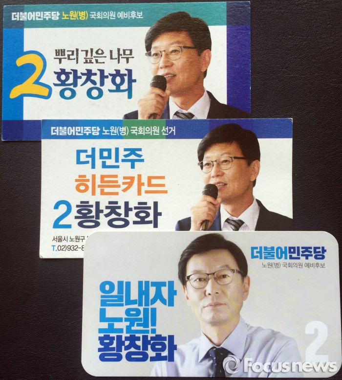 서울 노원구병 더불어민주당(더민주) 황창화 후보는 이 달에만 벌써 세 번 명함 디자인을 바꿨다. 선거 구호와 사진 위치, 글씨체 등을 계속 새롭게 했다.