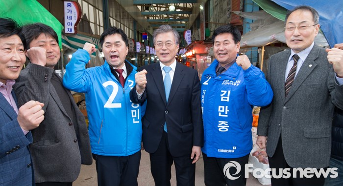 (논산=포커스뉴스) 문재인 더불어민주당 전 대표가 29일 오후 충남 논산시 중앙시장을 방문해 김종민 후보의 지지를 호소하며 파이팅을 하고 있다.