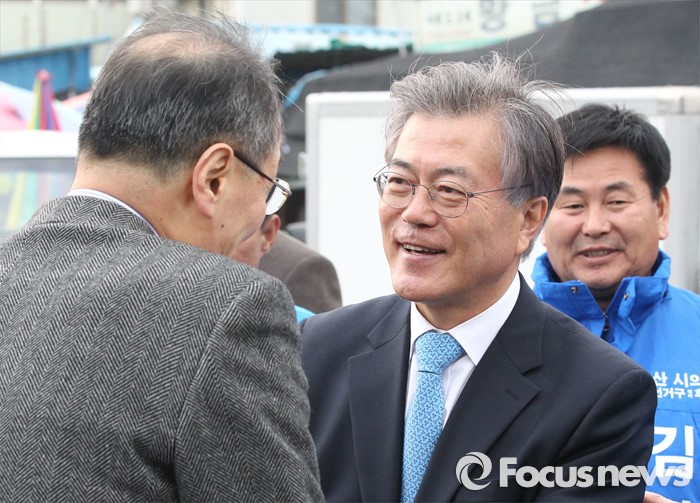 (논산=포커스뉴스) 문재인 더불어민주당 전 대표가 29일 오후 충남 논산시 중앙시장을 방문해 시민들과 악수하며 김종민 후보의 지지를 호소하고 있다.
