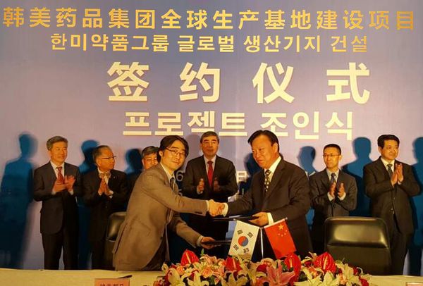 한편, 한미약품 그룹은 이번 투자를 위해 29일 오전 중국 연태경제기술개발구 관리위원회(대표 왕왈의 서기)와 연태 쉐라톤호텔에서 프로젝트 조인식을 진행했다.한미사이언스 임종윤 대표이사(좌)와 중국 연태경제기술개발구 관리위원회 대표 왕왈의 서기가 29일 열린 프로젝트 조인식에서 두 손을 맞잡았다. <사진출처=한미약품>