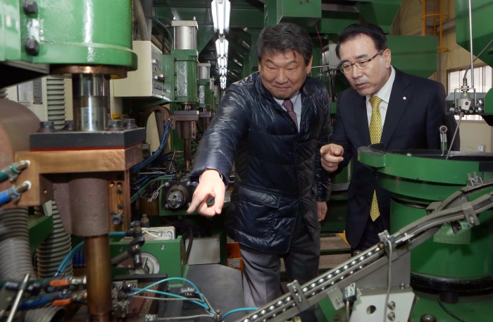 한편, 조용병 은행장은 매년 상하반기에 현장경영을 하고 있으며, 취임 후 현재까지 50회 이상 현장 방문을 실시했다는 게 은행 측 설명이다.조용병 신한은행장(사진 오른쪽)이 29일 천안시 동남구 소재 삼진정공을 방문해 어진선 대표이사(사진 왼쪽)으로부터 생산공정에 대한 설명을 듣고 있는 모습.<사진제공=신한은행>