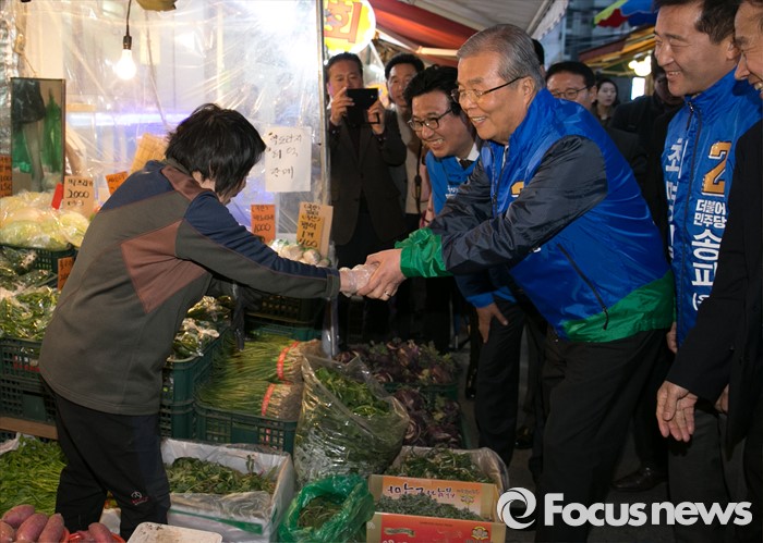 (서울=포커스뉴스) 김종인 더불어민주당 비대위 대표가 29일 오후 서울 송파구 새마을시장을 방문해 상인들과 인사하며 지지를 호소하고 있다.