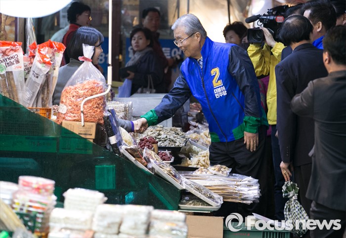 (서울=포커스뉴스) 김종인 더불어민주당 비대위 대표가 29일 오후 서울 송파구 새마을시장을 방문해 상인들과 인사하며 지지를 호소하고 있다.