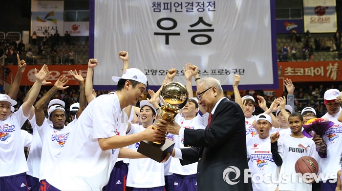 (고양=포커스뉴스) 29일 고양체육관에서 열린 2015-2016 프로농구 챔피언결정전 6차전에서 승리하며 4승 2패로 우승한 오리온 주장 김도수가 김영기 KBL 총재로부터 우승 트로피를 받고 있다.