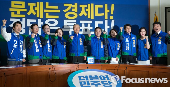 | △ 파이팅 외치는 더민주 후보들과 김종인 |