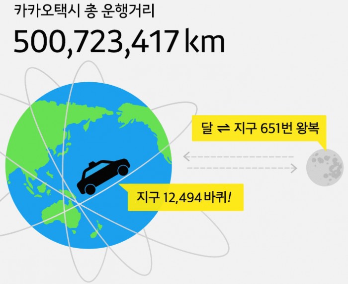정주환 카카오 O2O·커머스사업부문 총괄부사장은 "카카오택시는 모바일 시대의 O2O 서비스를 대표하는 아이콘이자 생활 필수 품목으로 자리 잡았다"며 "한 발 더 나아가 앞으로의 1년은 이용자가 보다 만족할 수 있도록 서비스 품질 강화와 이용 경험 고도화에 집중할 계획"이라고 밝혔다.카카오택시 총 운행거리 <사진제공=카카오>