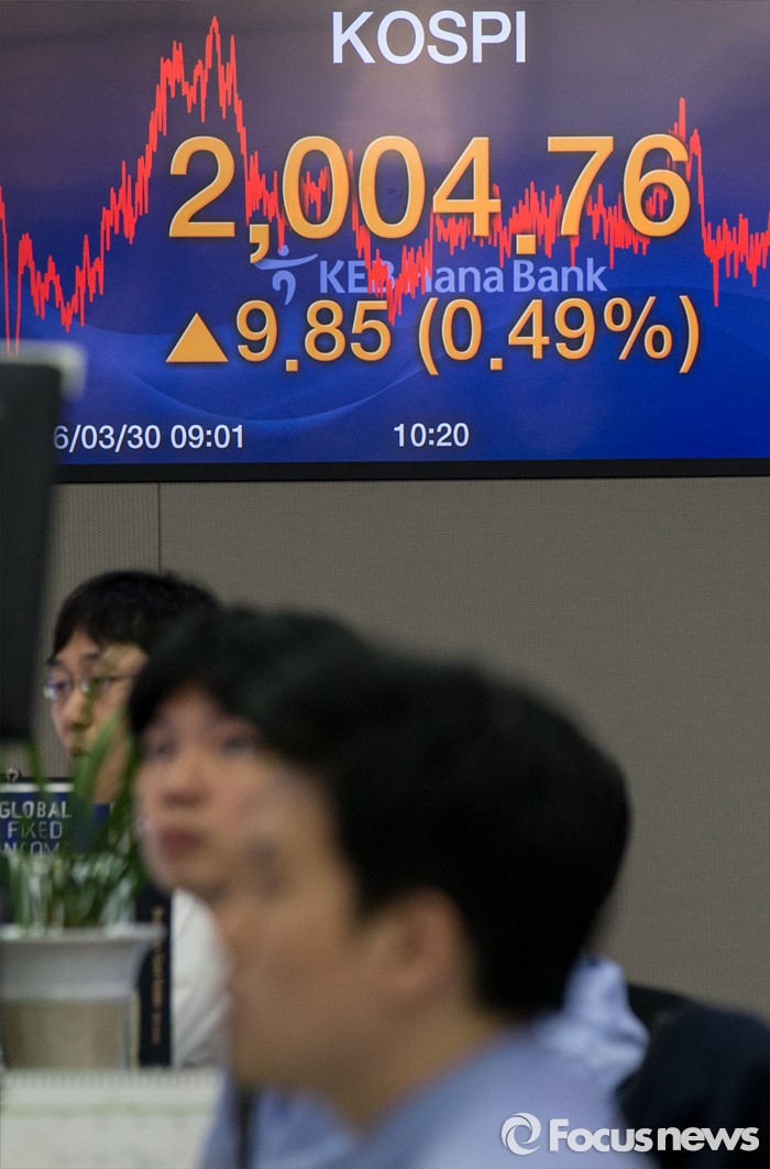 (서울=포커스뉴스) 30일 서울 중구 KEB외환은행 본점 딜링룸 전광판에 코스피 지수가 전일보다 9.85p (0.49%) 상승한 2004.76을 나타내고 있다. 이날 코스피지수는 재닛 옐런 미국 중앙은행(Fed) 의장의 비둘기파 발언에 힘입어 시가 기준 2000선을 돌파했다. 코스피가 시가 기준으로 2000선을 돌파한 것은 지난해 12월24일(2009.34) 이후 처음이다.