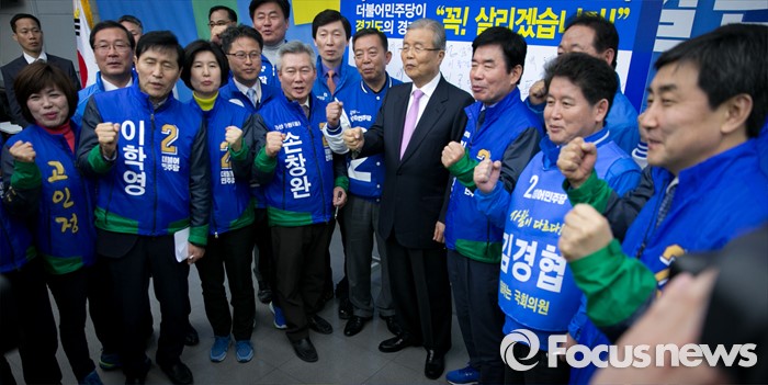 (수원=포커스뉴스) 30일 오전 수원 팔달구 경기도의회에서 열린 더불어민주당 경제살리기 경기 국회의원 후보자 연석회의에 참석한 김종인 비대위 대표, 이종걸 원내대표 등 지도부 및 후보들이 취재진을 향해 파이팅을 외치고 있다.