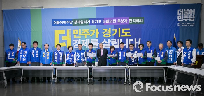 (수원=포커스뉴스) 30일 오전 수원 팔달구 경기도의회에서 열린 더불어민주당 경제살리기 경기 국회의원 후보자 연석회의에 참석한 김종인 비대위 대표와 후보들이 경제살리기 결의문 낭독을 하고 있다.
