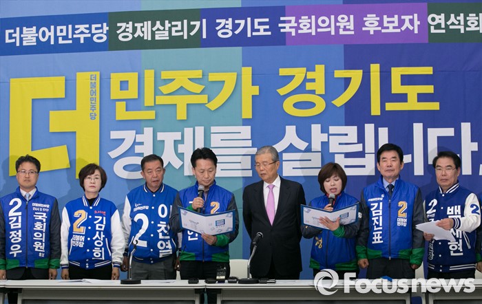 (수원=포커스뉴스) 30일 오전 수원 팔달구 경기도의회에서 열린 더불어민주당 경제살리기 경기 국회의원 후보자 연석회의에 참석한 김종인 비대위 대표와 후보들이 경제살리기 결의문 낭독을 하고 있다.