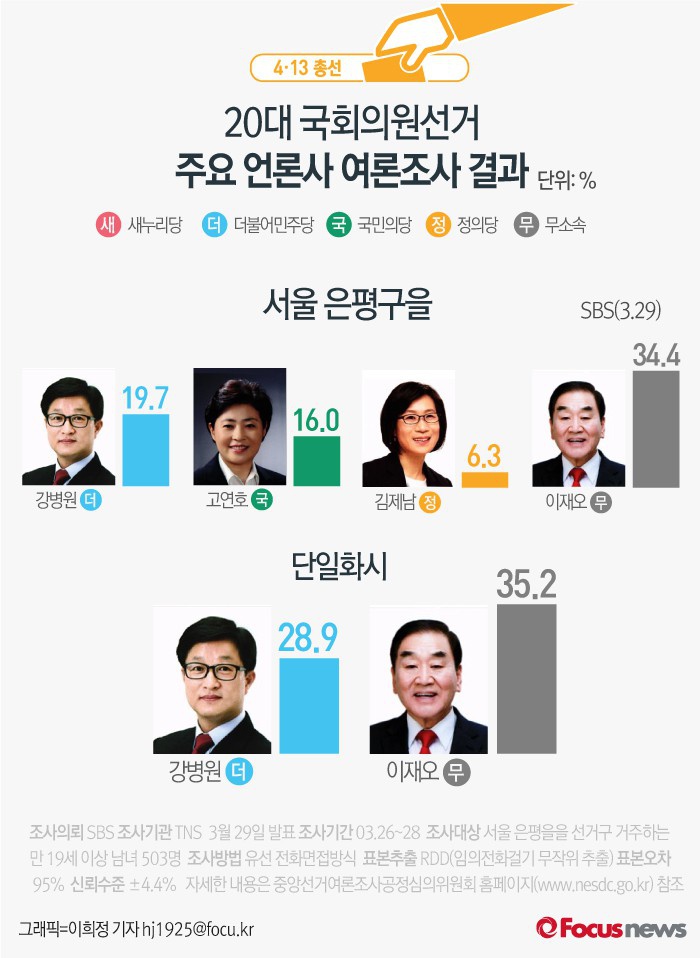 (서울=포커스뉴스) SBS가 여론조사기관 TNS에 의뢰해 이날 발표한 결과에 따르면 친이계 좌장 이재오 의원의 지지율이 34.4%를 기록, 19.7%를 얻은 더불어민주당의 강병원 후보를 10%포인트 넘게 따돌렸다. 야권 후보들이 강병원 후보로 단일화를 할 경우엔 격차가 오차범위 내로 좁혀지는 것으로 나타났다.