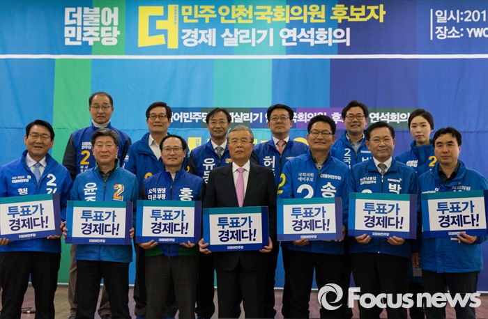 (인천=포커스뉴스) 김종인(가운데) 더불어민주당 비대위 대표와 후보들이 30일 오후 인천 남동구 정당선거사무소에서 열린 더불어민주당 경제살리기 인천 20대 총선 후보자 연석회의에 참석해 손팻말을 들고 있다.