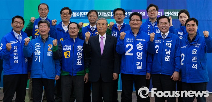 (인천=포커스뉴스) 김종인(가운데) 더불어민주당 비대위 대표와 후보들이 30일 오후 인천 남동구 정당선거사무소에서 열린 더불어민주당 경제살리기 인천 20대 총선 후보자 연석회의에 참석해 파이팅을 외치고 있다.