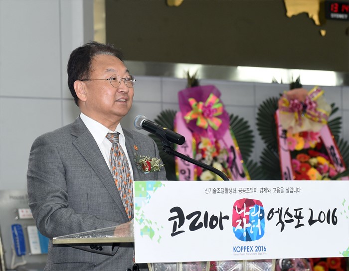 (일산=포커스뉴스) 유일호 부총리 겸 기획재정부 장관이 30일 경기 일산 킨텍스 전시관에서 열린 '2016 코리아 나라장터 엑스포'에 참석, 축사를 하고 있다.