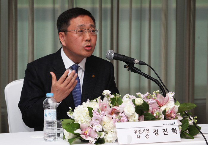 한편, 유진기업 주가는 전날보다 4.27% 내린 4600원에 장을 마감했다. 오전 한때 4850원까지 올랐다가 ㈜동양 경영권을 확보하는 데 실패했다는 소식이 전해진 후 하락 전환했다.유진기업 정진학 사장이 22일 ㈜동양 지분 매입에 대한 입장을 밝히고 있다.