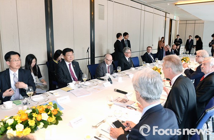 (서울=포커스뉴스) 주형환 산업통상자원부 장관이 30일 오후 서울 종로구 포시즌호텔에서 열린 주한 유럽연합(EU) 대사 및 EU 회원국 대사단과의 오찬 간담회에 참석해 한-EU 경제협력과 향후 추진 방향 등과 관련하여 의견을 교환하고 있다.