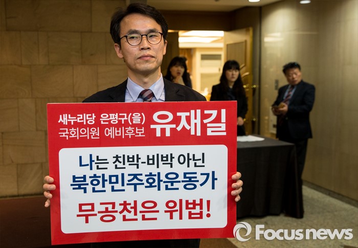 (서울=포커스뉴스) 30일 오후 서울 중구 프레스센터에서 열린 김무성 새누리당 대표 초청 관훈토론회장 입구에서 서울 은평을 출마가 무산된 유재길 예비후보가 무공천은 위법임을 주장하는 팻말을 들고 있다.