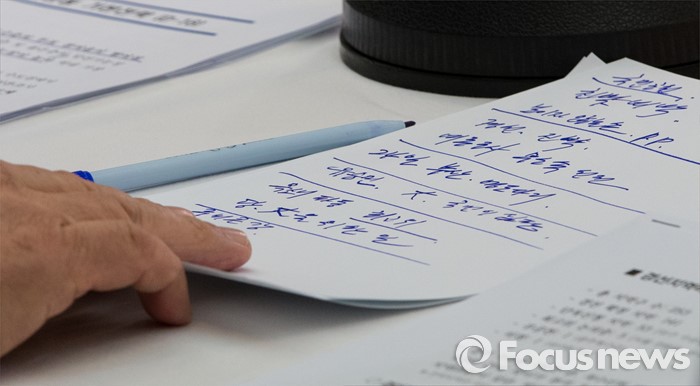 (서울=포커스뉴스) 30일 오후 서울 중구 프레스센터에서 열린 관훈클럽 초청 관훈토론회에 참석한 김무성 새누리당 대표가 메모를 만지고 있다. 메모에는 '경선, 진박, 여론조사 무소속 선전, 영도다리, 유승민, 욕쇄파동' 등이 적혀 있다.