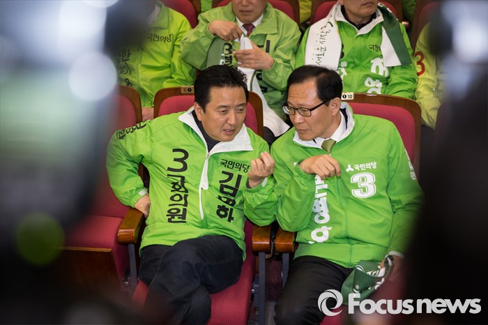 (서울=포커스뉴스) 30일 오후 서울 여의도 국회에서 열린 총선 승리를 위한 국민의당 수도권 후보 출정식에서 김영환(왼쪽) 의원과 문병호 의원이 대화를 나누고 있다.