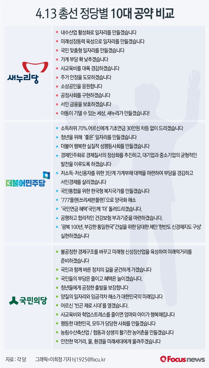 (서울=포커스뉴스) 다가오는 4.13 20대 총선을 앞두고 주요 정당별 핵심 10대 공약을 비교했다.