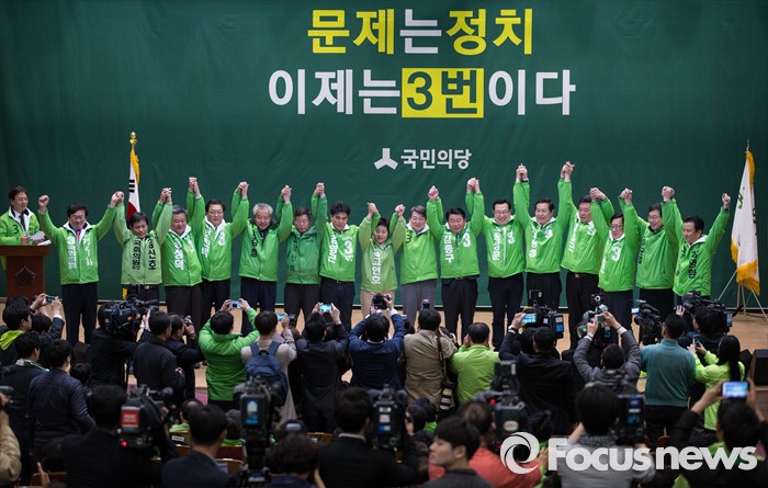(서울=포커스뉴스) 안철수 국민의당 상임공동대표를 비롯한 후보들이 30일 오후 서울 여의도 국회 의원회관 대회의실에서 열린 총선승리를 위한 국민의당 수도권 후보 출정식에서 승리를 다짐하며 세레머니를 하고 있다.