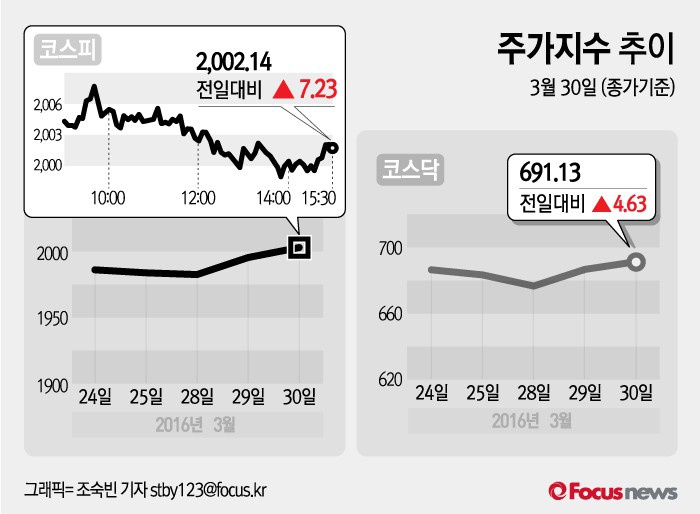 (서울=포커스뉴스) 30일 코스피지수가 재닛 옐런 미국 연방준비제도 의장이 점진적 기준금리 인상을 시사함에 따라 전일 대비 0.36%(7.23포인트) 오른 2002.14에 장을 마치며 2000선을 돌파했다.