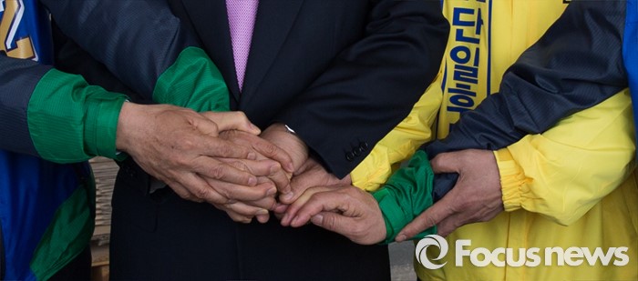 | △ 야권연대 위해 손 모은 김종인과 인천지역 후보들 |